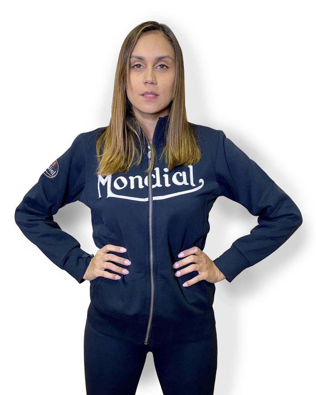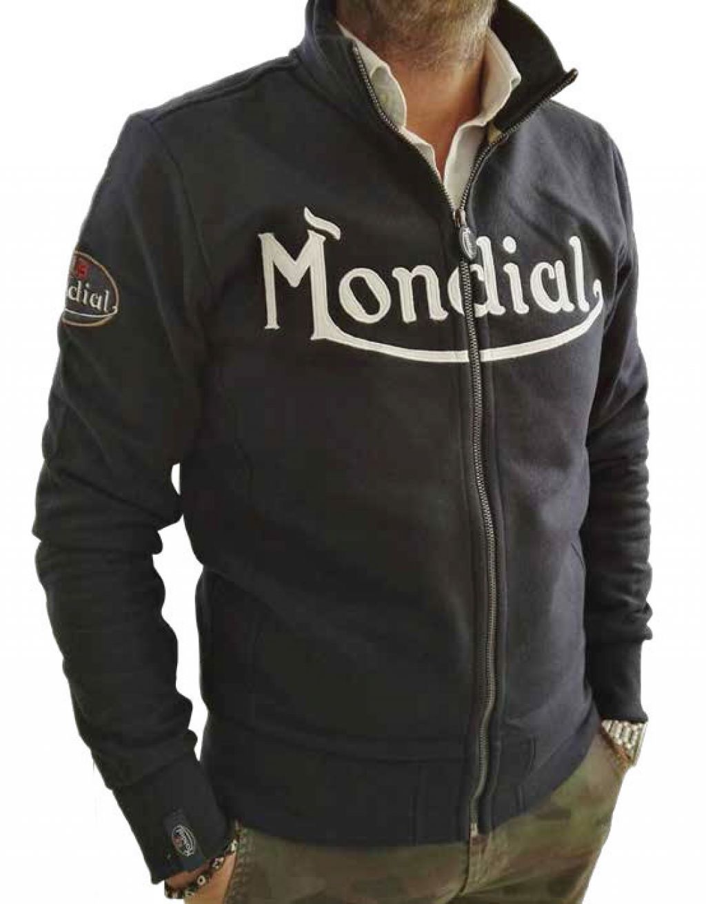 Felpa FB Mondial blue scuro in cotone con colletto coreana cerniera anteriore loghi ricamati su polsino e su spalla.